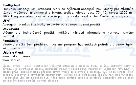 Plenkové kalhotky Seni Standard Air M se zvýšenou absorpcí, jsou určeny pro střední a těžkou močovou inkontinenci a inkont. stolice, obvod pasu 75-110, savost 2300 ml, 30ks. Dvojité anatom.tvarované savé jádro pro větší pocit sucha. Částečně prodyšné.