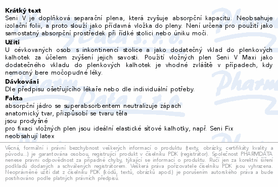 Seni V je doplňková separační plena, která zvyšuje absorpční kapacitu. Neobsahuje izolační folii, a proto slouží jako přídavná vložka do pleny. Není určena pro použití jako samostatný absorpční prostředek při řídké stolici nebo úniku moči.