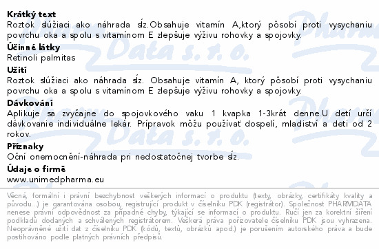 Roztok slúžiaci ako náhrada sĺz.Obsahuje vitamín A,ktorý pôsobí proti vysychaniu povrchu oka a spolu s vitamínom E zlepšuje výživu rohovky a spojovky.