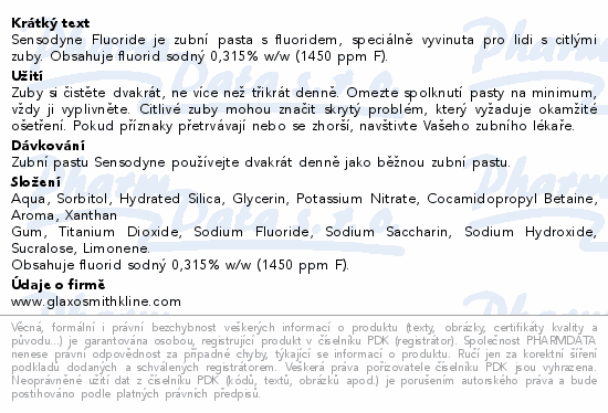 Sensodyne Fluoride je zubní pasta s fluoridem, speciálně vyvinuta pro lidi s citlými zuby. Obsahuje fluorid sodný 0,315% w/w (1450 ppm F).