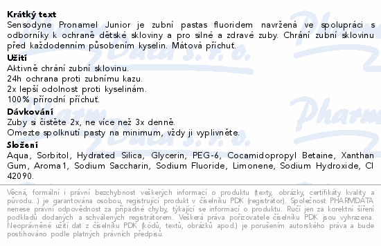 Sensodyne Pronamel Junior je zubní pastas fluoridem navržená ve spolupráci s odborníky k ochraně dětské skloviny a pro silné a zdravé zuby. Chrání zubní sklovinu před každodenním působením kyselin. Mátová příchuť.