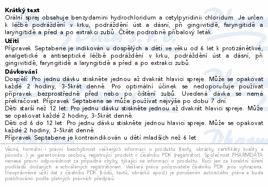 Orální sprej obsahuje benzydamini hydrochloridum a cetylpyridinii chloridum. Je určen k léčbě podráždění v krku, podráždění úst a dásní, při gingivitidě, faryngitidě a laryngitidě a před a po extrakci zubů. Čtěte pozorně příbalový leták.