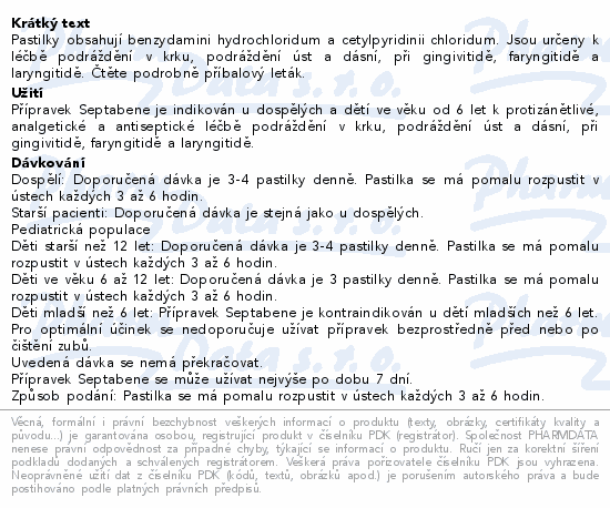 Pastilky obsahují benzydamini hydrochloridum a cetylpyridinii chloridum. Jsou určeny k léčbě podráždění v krku, podráždění úst a dásní, při gingivitidě, faryngitidě a laryngitidě. Čtěte pozorně příbalový leták.