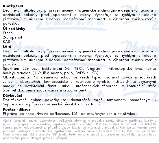 Dezinfekční alkoholový přípravek určený k hygienické a chirurgické dezinfekci rukou a k dezinfekci pokožky před operacemi a vpichy. Vyznačuje se rychlým a dlouho přetrvávajícím účinkem s dobrou odmašťovací schopností a výbornou snášenlivostí s pokožkou.