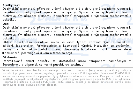 Dezinfekční alkoholový přípravek určený k hygienické a chirurgické dezinfekci rukou a k dezinfekci pokožky před operacemi a vpichy. Vyznačuje se rychlým a dlouho přetrvávajícím účinkem s dobrou odmašťovací schopností a výbornou snášenlivostí s pokožkou.