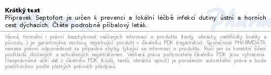 Přípravek Septofort je určen k prevenci a lokální léčbě infekcí dutiny ústní a horních cest dýchacích. Čtěte pozorně příbalový leták.