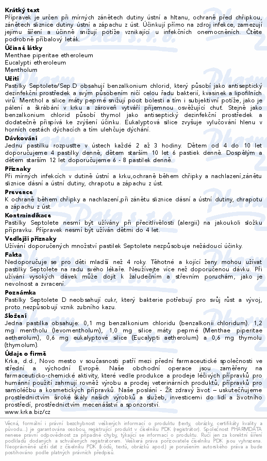 Pastilky Septolete D obsahují benzalkonium-chlorid, který má antiseptický účinek, tj. ničí mnohé typy bakterií a některé druhy kvasinek. Pastilky Septolete D působí přímo na mikroorganismy způsobující onemocnění úst a hltanu. Zabraňují rozšíření infekce a účinně zmírňují obtíže spojené s onemocněním ústní dutiny a hltanu.