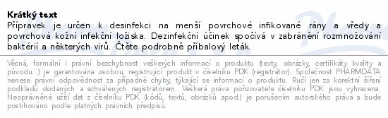 Přípravek je určen k desinfekci na menší povrchové infikované rány a vředy a povrchová kožní infekční ložiska. Dezinfekční účinek spočívá v zabránění rozmnožování baktérií a některých virů. Čtěte pozorně příbalový leták.