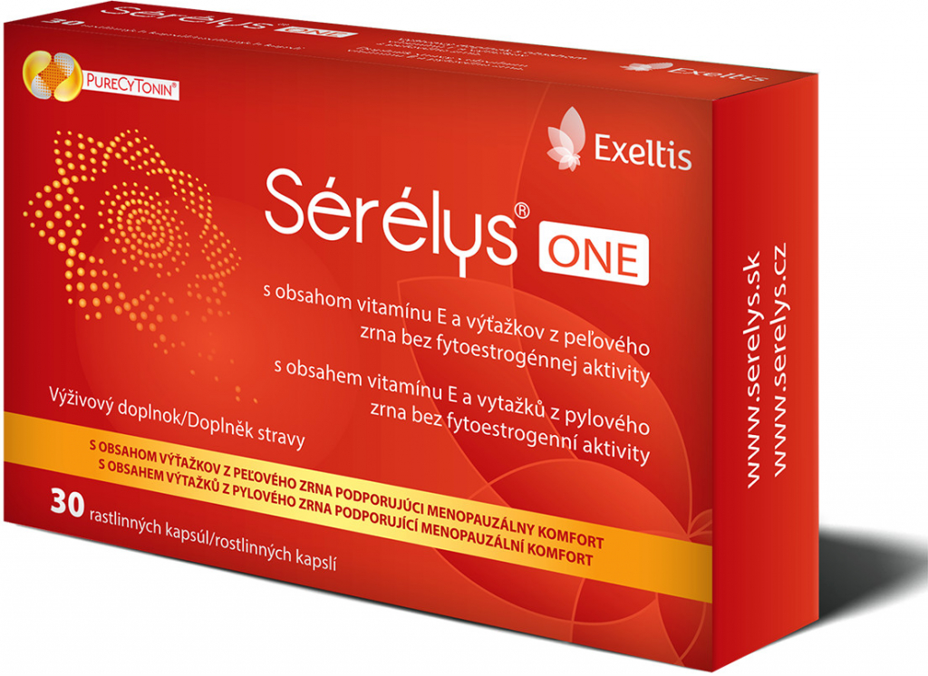 Sérélys ONE je doplněk stravy s obsahem výtažků pylového zrna, podporující menopauzální komfort, a vitaminu E, který přispívá k ochraně buněk před oxidativním stresem.