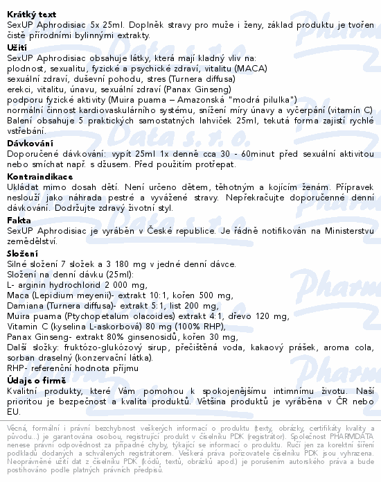 SexUP Aphrodisiac 5x 25ml. Doplněk stravy pro muže i ženy, základ produktu je tvořen čistě přírodními bylinnými extrakty.