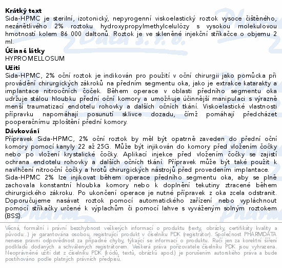 Sida-HPMC je sterilní, izotonický, nepyrogenní viskoelastický roztok vysoce čištěného, nezánětlivého 2% roztoku hydroxypropylmethylcelulózy s vysokou molekulovou hmotností kolem 86 000 daltonů. Roztok je ve skleněné injekční stříkačce o objemu 2 ml.