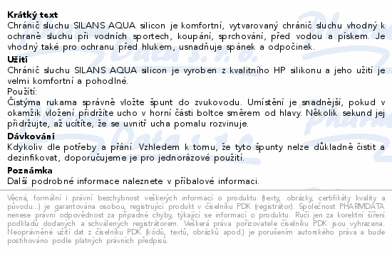 Chránič sluchu SILANS AQUA silicon je komfortní, vytvarovaný chránič sluchu vhodný k ochraně sluchu při vodních sportech, koupání, sprchování, před vodou a pískem. Je vhodný také pro ochranu před hlukem, usnadňuje spánek a odpočinek.