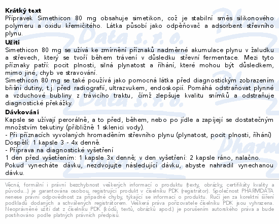 Přípravek Simethicon 80 mg obsahuje simetikon, což je stabilní směs silikonového polymeru a oxidu křemičitého. Látka působí jako odpěňovač a adsorbent střevního plynu.
