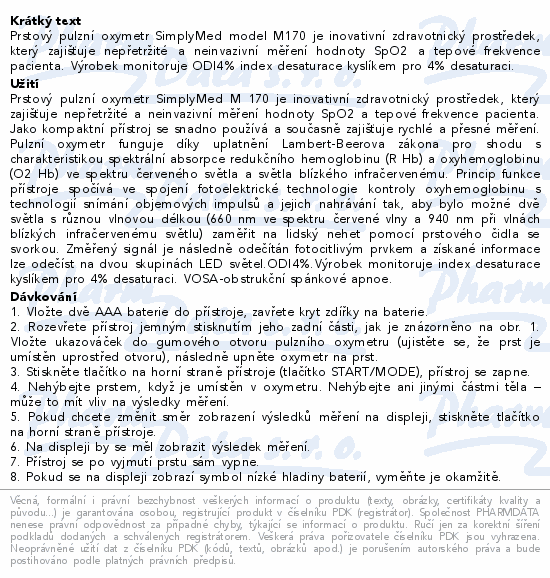 Prstový pulzní oxymetr SimplyMed model M170 je inovativní zdravotnický prostředek, který zajišťuje nepřetržité a neinvazivní měření hodnoty SpO2 a tepové frekvence pacienta. Výrobek monitoruje ODI4% index desaturace kyslíkem pro 4% desaturaci.
