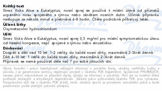 Sinex Vicks Aloe a Eukalyptus je nosní sprej, který se používá k místní úlevě od příznaků ucpaného nosu spojeného s nachlazením nebo rýmou. Účinek přípravku nastupuje za několik minut a přetrvává až 12 hodin.