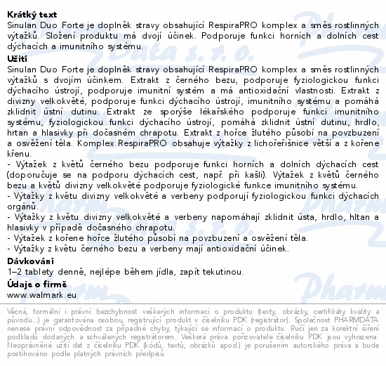 Sinulan Duo Forte je doplněk stravy obsahující RespiraPRO komplex a směs rostlinných výtažků. Složení produktu má dvojí účinek. Podporuje funkci horních a dolních cest dýchacích a imunitního systému.