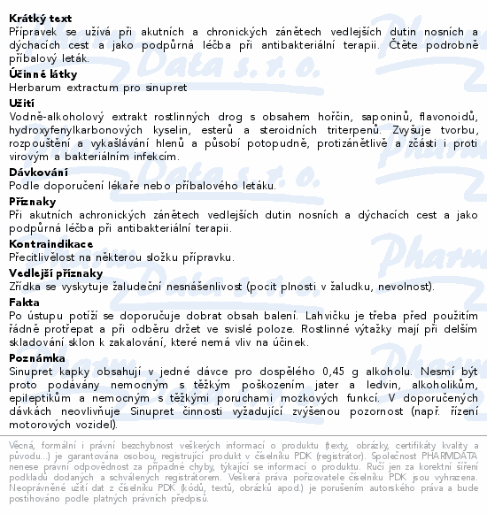 Sinupret, perorální kapky, roztok, je vodně-alkoholový extrakt rostlinných drog, který zvyšuje tvorbu, rozpouštění a vykašlávání hlenů. Obsahuje 5 rostlinných extraktů (hořec žlutý, prvosenka jarní, šťovík kyselý, sporýš lékařský, bez černý), které pomáhají při léčbě rýmy, nachlazení, chronického i akutního zánětu dutin.