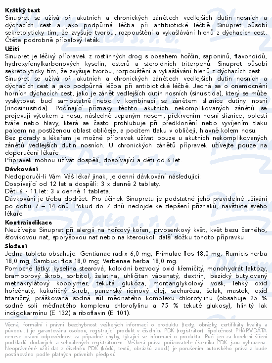Sinupret se užívá při akutních a chronických zánětech vedlejších dutin nosních a dýchacích cest a jako podpůrná léčba při antibiotické léčbě. Sinupret působí sekretolyticky tím, že zvyšuje tvorbu, rozpouštění a vykašlávání hlenů z dýchacích cest. Čtěte pozorně příbalový leták.