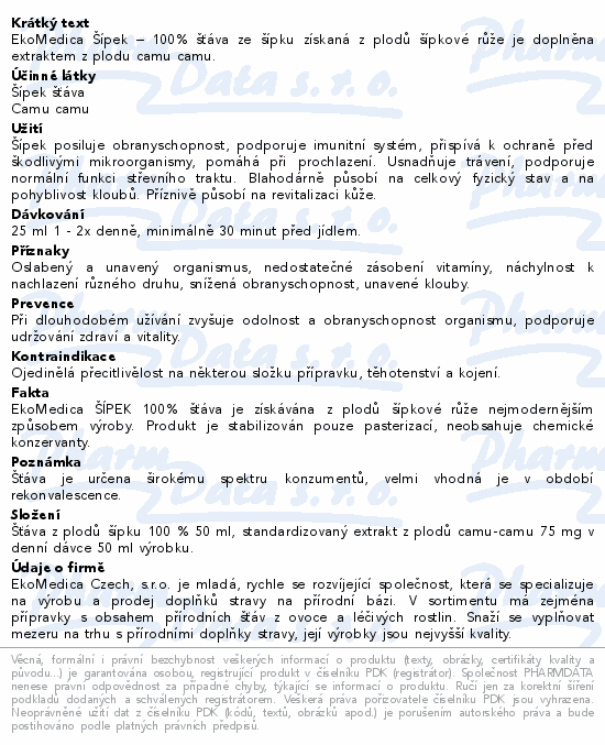 EkoMedica Šípek – 100% šťáva ze šípku získaná z plodů šípkové růže je doplněna extraktem z plodu camu camu.