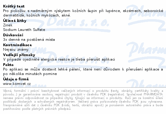 Speciálně vyvinutý roztok ve formě spreje k aplikaci na pokožku s nadměrných výskytem lupů, šupin a suchých a drsných okrsků. Suchou pleť zvláčňuje, snižuje svědění, odstraňuje nepříjemné lupy a zlepšuje vzhled kůže. Sprej je vhodný na většíplochy a plošnou aplikaci.