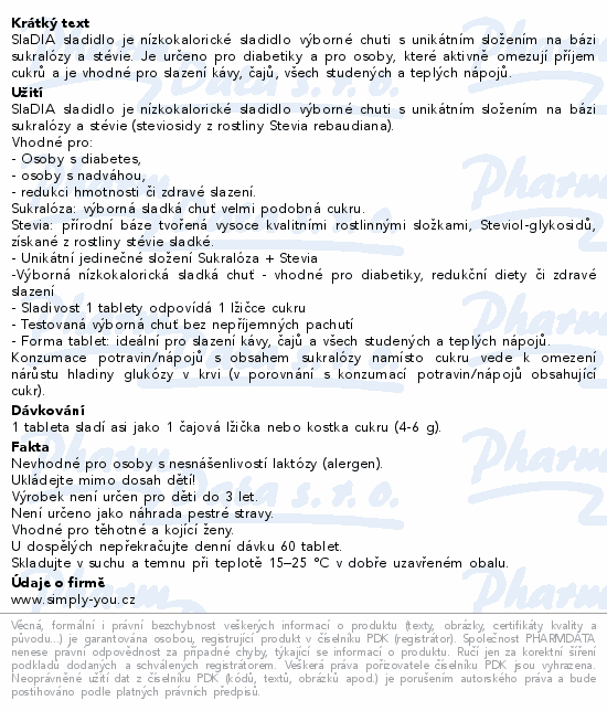 SlaDIA sladidlo je nízkokalorické sladidlo výborné chuti s unikátním složením na bázi sukralózy a stévie. Je určeno pro diabetiky a pro osoby, které aktivně omezují příjem cukrů a je vhodné pro slazení kávy, čajů, všech studených a teplých nápojů.