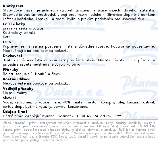 Slivovicové mazání je jedinečný výrobek založený na zkušenostech lidového léčitelství. Slivovice je tradiční prostředek v boji proti všem neduhům. Slivovice doplněná účinkem kaštanu koňského, kostivalu a sedmi bylin je pravým potěšením pro unavené tělo.