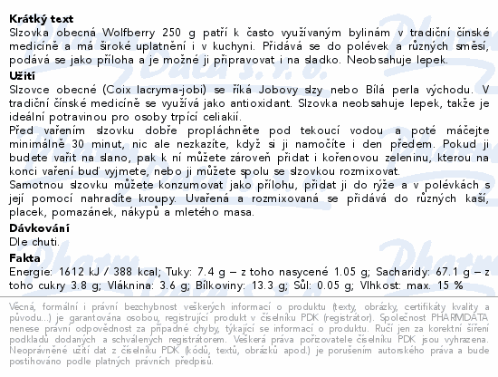Slzovka obecná Wolfberry 250 g patří k často využívaným bylinám v tradiční čínské medicíně a má široké uplatnění i v kuchyni. Přidává se do polévek a různých směsí, podává se jako příloha a je možné ji připravovat i na sladko. Neobsahuje lepek.