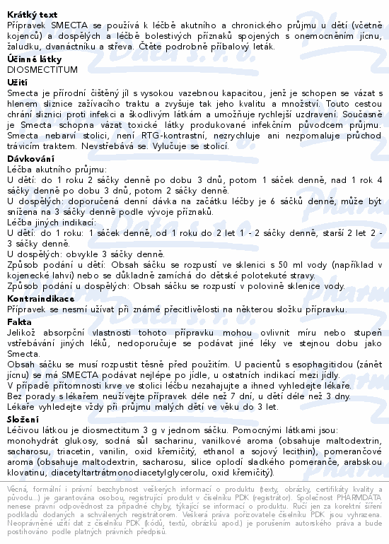 Přípravek SMECTA se používá k léčbě akutního a chronického průjmu u dětí (včetně kojenců) a dospělých a léčbě bolestivých příznaků spojených s onemocněním jícnu, žaludku, dvanáctníku a střeva. Čtěte pozorně příbalový leták.