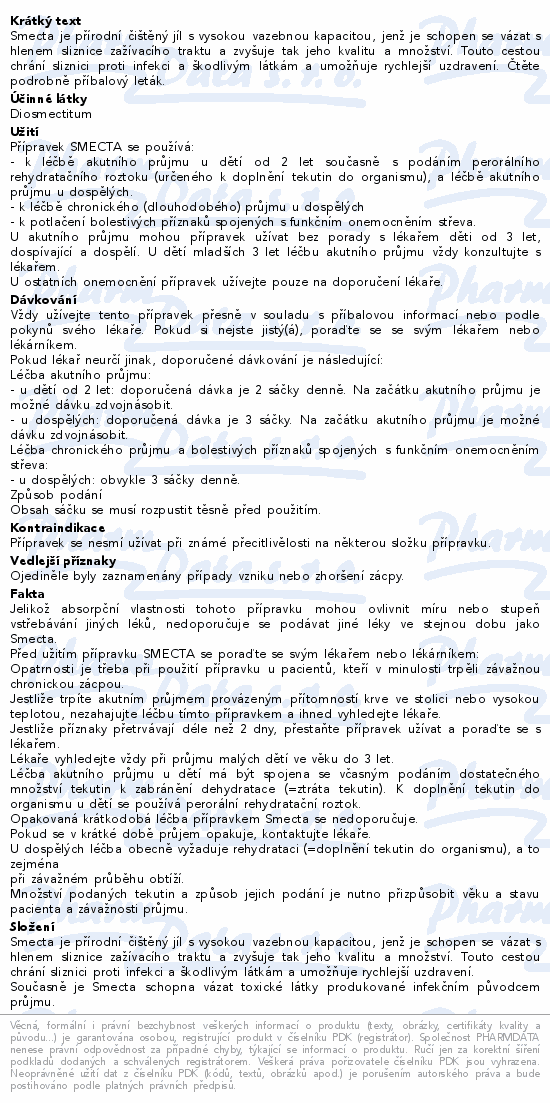 Smecta je přírodní čištěný jíl s vysokou vazebnou kapacitou, jenž je schopen se vázat s hlenem sliznice zažívacího traktu a zvyšuje tak jeho kvalitu a množství. Touto cestou chrání sliznici proti infekci a škodlivým látkám a umožňuje rychlejší uzdravení. Čtěte pozorně příbalový leták.