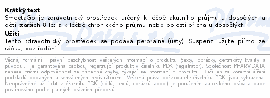 SmectaGo je zdravotnický prostředek určený k léčbě akutního průjmu u dospělých a dětí starších 8 let a k léčbě chronického průjmu nebo bolestí břicha u dospělých.
