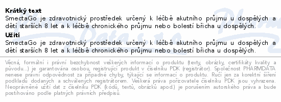 SmectaGo je zdravotnický prostředek určený k léčbě akutního průjmu u dospělých a dětí starších 8 let a k léčbě chronického průjmu nebo bolestí břicha u dospělých.