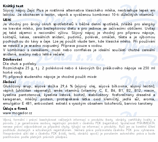 Sójový nápoj Zajíc Plus je rostlinná alternativa klasického mléka, neobsahuje lepek ani laktózu. Je obohacen o lecitin, vápník a vyváženou kombinaci 10-ti důležitých vitamínů.