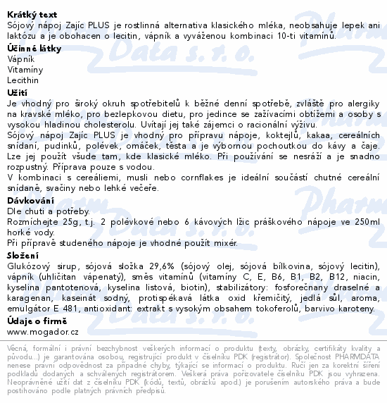 Sójový nápoj Zajíc PLUS je rostlinná alternativa klasického mléka, neobsahuje lepek ani laktózu a je obohacen o lecitin, vápník a vyváženou kombinaci 10-ti vitamínů.