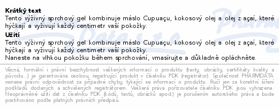 Tento výživný sprchový gel kombinuje máslo Cupuaçu, kokosový olej a olej z açaí, které hýčkají a vyživují každý centimetr vaší pokožky.