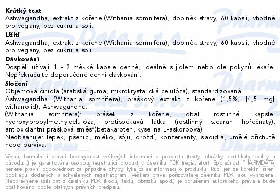 Ashwagandha, extrakt z kořene (Withania somnifera), doplněk stravy, 60 kapslí, vhodné pro vegany, bez cukru a soli.