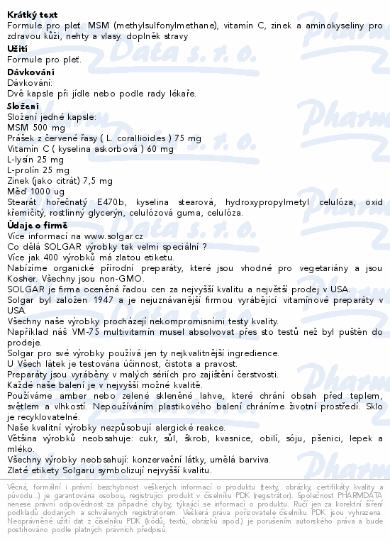 Formule pro pleť. MSM (methylsulfonylmethane), vitamín C, zinek a aminokyseliny pro zdravou kůži, nehty a vlasy. doplněk stravy