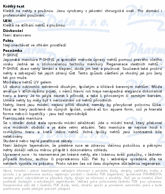 Kleště na nehty s pružinou. Jsou vyrobeny z jakostní chirurgické oceli. Pro domácí i profesionální používání.