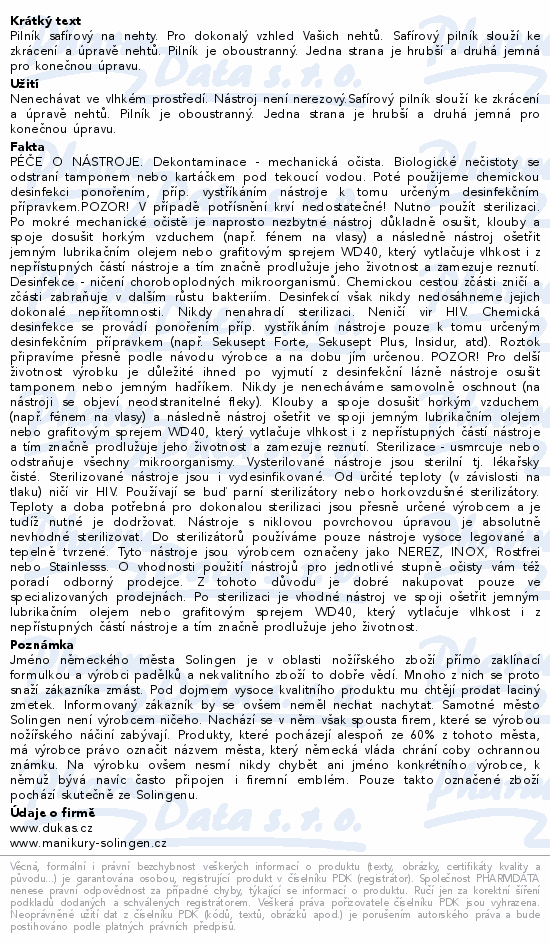 Pilník safírový na nehty. Pro dokonalý vzhled Vašich nehtů. Safírový pilník slouží ke zkrácení a úpravě nehtů. Pilník je oboustranný. Jedna strana je hrubší a druhá jemná pro konečnou úpravu.