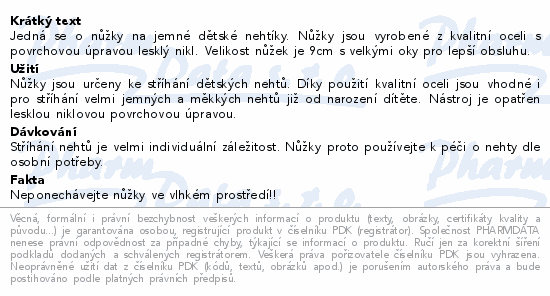 Jedná se o nůžky na jemné dětské nehtíky. Nůžky jsou vyrobené z kvalitní oceli s povrchovou úpravou lesklý nikl. Velikost nůžek je 9cm s velkými oky pro lepší obsluhu.