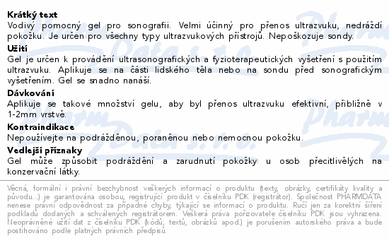 Vodivý pomocný gel pro sonografii. Velmi účinný pro přenos ultrazvuku, nedráždí pokožku. Je určen pro všechny typy ultrazvukových přístrojů. Nepoškozuje sondy.