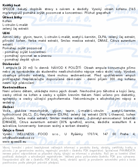 SPEED8 -tekutý doplněk stravy s cukrem a sladidly. Vysoký obsah kofeinu (165 mg/amppuli) pomáhá zvýšit pozornost a koncentraci. Příchuť grapefruit.