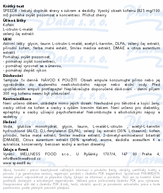 SPEED8 - tekutý doplněk stravy s cukrem a sladidly. Vysoký obsah kofeinu (165 mg/20 ml) pomáhá zvýšit pozornost a koncentraci. Příchuť cherry.