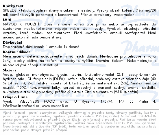 SPEED8 - tekutý doplněk stravy s cukrem a sladidly. Vysoký obsah kofeinu (165 mg/20 ml) pomáhá zvýšit pozornost a koncentraci. Příchuť strawberry- watermelon.