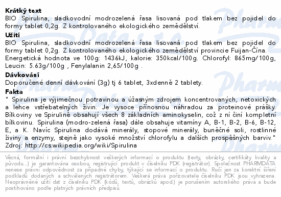 BIO Spirulina, sladkovodní modrozelená řasa lisovaná pod tlakem bez pojidel do formy tablet 0,2g. Z kontrolovaného ekologického zemědělství.