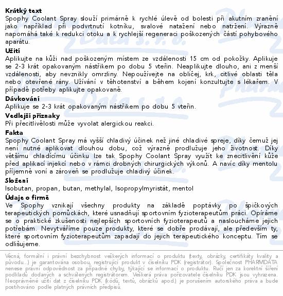 Spophy Coolant Spray slouží primárně k rychlé úlevě od bolesti při akutním zranění jako například při podvrtnutí kotníku, svalové natažení nebo natržení. Výrazně napomáhá také k redukci otoku a k rychlejší regeneraci poškozených částí pohybového aparátu.
