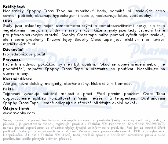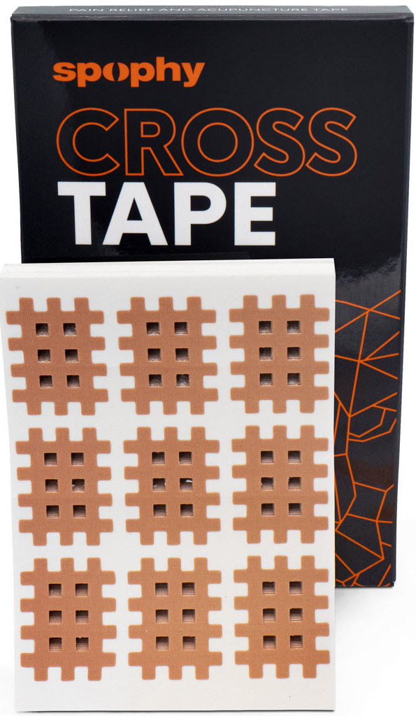 Neelastický Spophy Cross Tape na spoušťové body, pomáhá při svalových nebo cévních potížích, obsahuje hypoalergenní lepidlo, neobsahuje latex, voděodolný.