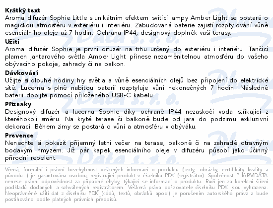 Aroma difuzér Sophie Little s unikátním efektem svítící lampy Amber Light se postará o magickou atmosféru v exteriéru i interiéru. Zabudovaná baterie zajistí rozptylování vůně esenciálního oleje až 7 hodin. Ochrana IP44, designový doplněk vaší terasy.