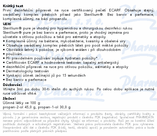 První dezinfekční přípravek na ruce certifikovaný pečetí ECARF. Obsahuje stejný, osvědčený komplex pěsticích přísad jako Sterillium®. Bez barviv a parfemace, komplexně účinný, na bázi propanolu.