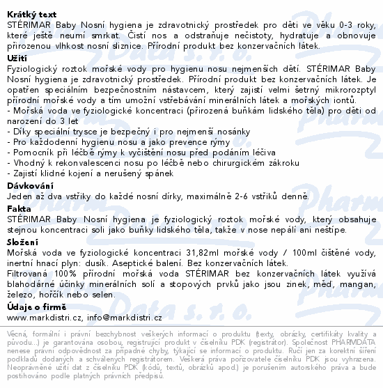 STÉRIMAR Baby Nosní hygiena je zdravotnický prostředek pro děti ve věku 0-3 roky, které ještě neumí smrkat. Čistí nos a odstraňuje nečistoty, hydratuje a obnovuje přirozenou vlhkost nosní sliznice. Přírodní produkt bez konzervačních látek.
