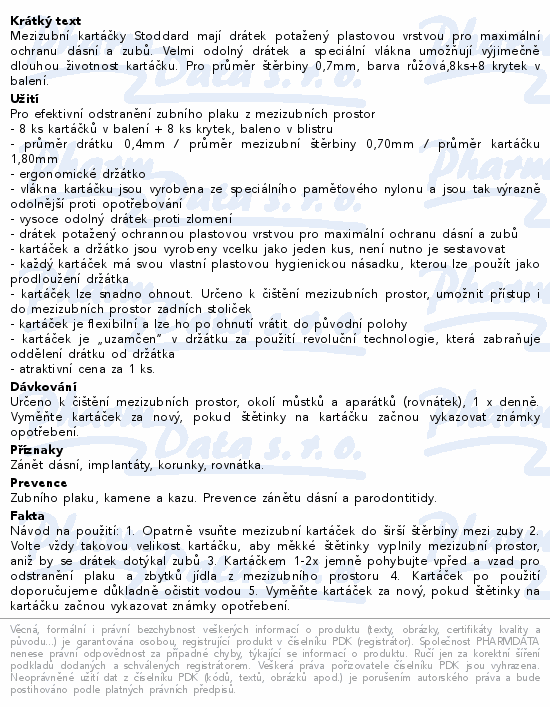 Mezizubní kartáčky Stoddard mají drátek potažený plastovou vrstvou pro maximální ochranu dásní a zubů. Velmi odolný drátek a speciální vlákna umožňují výjimečně dlouhou životnost kartáčku. Pro průměr štěrbiny 0,7mm, barva růžová,8ks+8 krytek v balení.